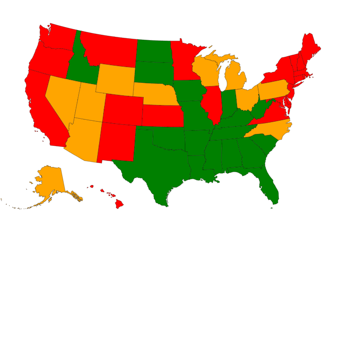 Green is illegal, yellow is limited, and red is legal (go to Abortion pills: Where are they legal and illegal? to click on each state’s specific law)